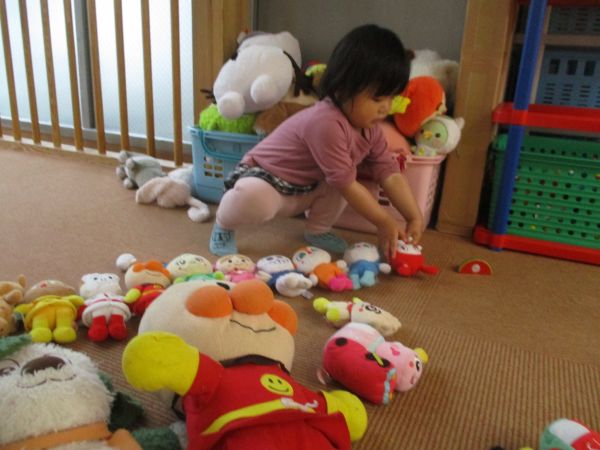 アンパンマンのぬいぐるみを真剣な顔で並べていました(^_-)-☆
