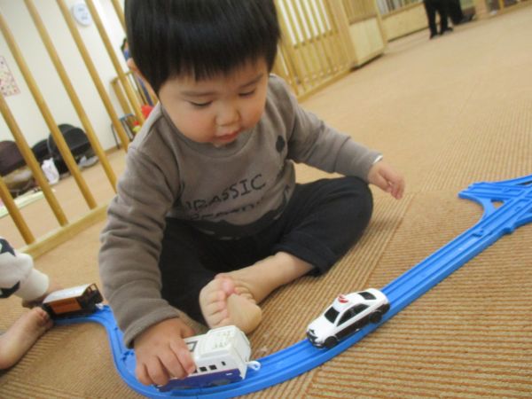 電車と車がしゅっぱーつ!!線路から落ちないように♡