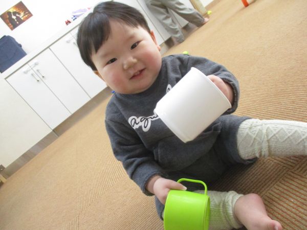コップを持って乾杯する?(^^♪ニコニコ可愛いね✩