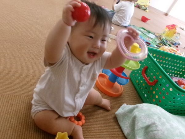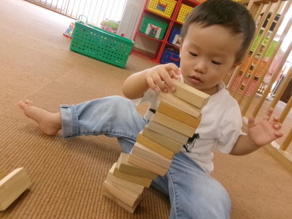 先生がドミノの様に並べた積み木を「えい!」と倒してみたりといろんな遊び方を楽しんでいましたよ(#^^#)