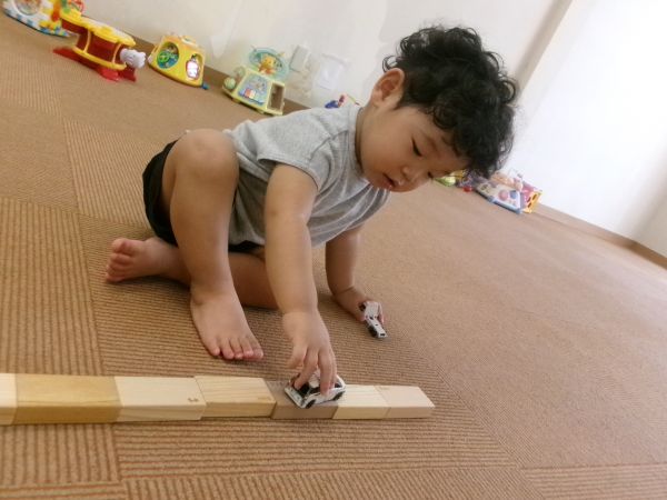 一人で高く積み上げたり、並べて道路にしてみたり、