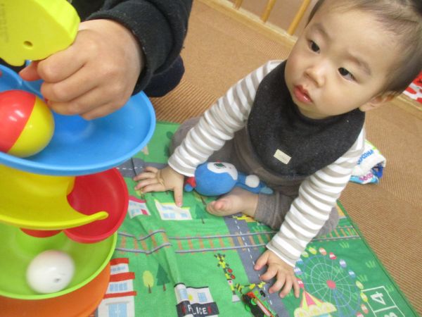 お兄さんお姉さんと小さいお友だちが同じおもちゃで遊んでニコニコ、保育士もほっこりしました♡