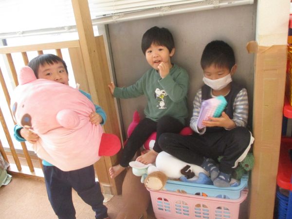 みんなでぬいぐるみで遊んだね✩フワフワ気持ちいい(^^♪