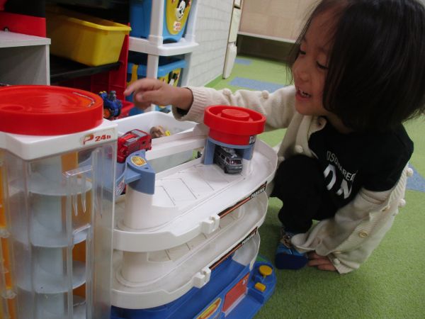 一番のりは車の大好きな男の子👦お気に入りの車を見つけて走らせたり立体駐車場の玩具に駐車したりして楽しそうに遊んでいます🎵