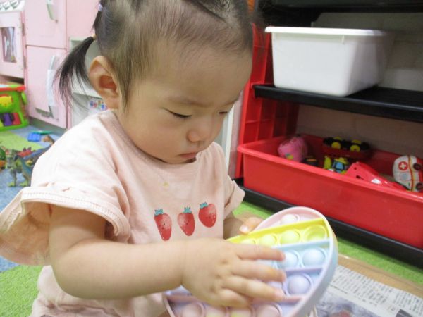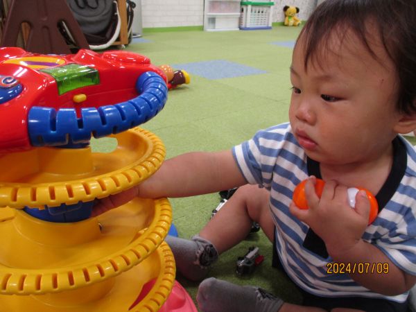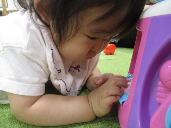 初めましてのお友だちはお部屋に入ってすぐ緊張した表情で涙する子が多かったですが、先生のお膝の上で車の玩具を走らせたり音の鳴る玩具を鳴らしたりするうちに場所にも先生にも慣れてくれたようでニコニコになってくれました✨