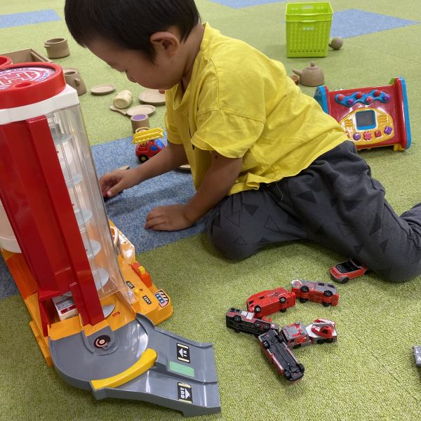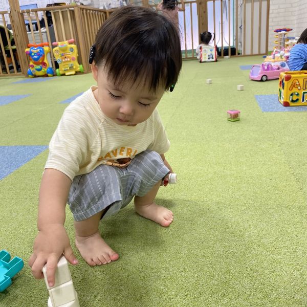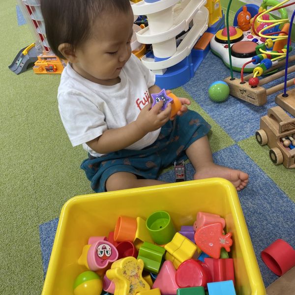 暑さになんか負けない子ども達は元気いっぱいに遊びに来てくれましたよ!初めましてのお友だちもいましたが、ニコニコ笑顔で自分の好きなキャラクターのおもちゃに手を伸ばして遊ぶ様子が見られました♪型はめブロックの中にアンパンマンのキャラクターシールが貼られているものがあるのですが、興味津々でアンパンマン・バイキンマン・ドキンちゃんを箱の中から探し出し見つめていました✨