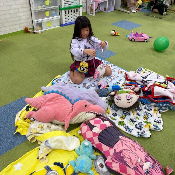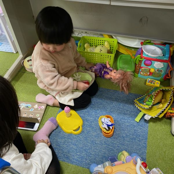 初めましてのお友だちも居ましたがみんな初めてとは思えないくらいあっという間に仲良くなって、トーマスブロックや塗り絵をして遊んでいましたよ😌💞机の下を秘密基地にして、ぬいぐるみやミニカーを持って来て子ども達だけの空間を作り上げて遊びを楽しんだり、おかえりランドの壁面のおひなさま、おだいりさまに向かって礼をして「おかしくださ~い」と言っている姿にはみんなが笑顔になりましたよ😆⭐子どもの考えや発想にはいつも驚かされています🧸❕