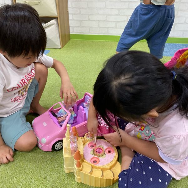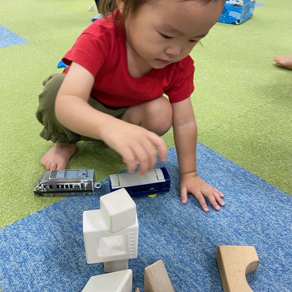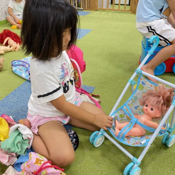 曇り空にも負けないくらい元気いっぱいの子ども達!今日もたくさんのお友だちが遊びに来てくれました🎵最近はベビーカーのおもちゃが大人気で、メルちゃんやお人形を乗せてよくお散歩しています!カバンにお洋服やお靴をいれて「さあ、保育園に行きますよ~」と保育園準備までしていて、まるで本当のお母さんのようでした🎶小さいお友だちは積み木をしていましたが保育者が積み上げて、それを`えいっ‘と倒すのが面白くて仕方ないようでした😆「遊ぼう」という言葉はなくとも、それぞれが好きな遊びをしていると自然と一緒に集まったお友だちと仲良くなって「じゃあ僕車もってくるね~」など役割分担しながら楽しんでいました🌼😌