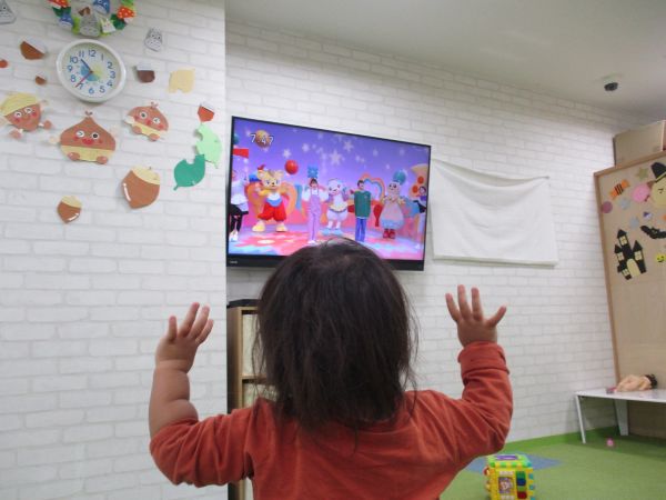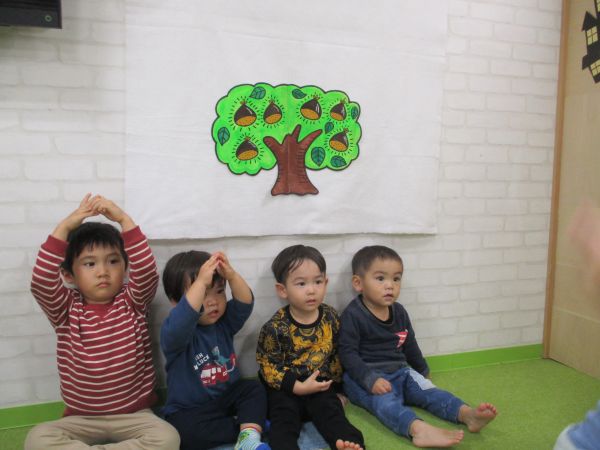 体操のテレビをみてみんなで踊ったり、おやつ前は大きな栗の木の下での手遊びをしました💖