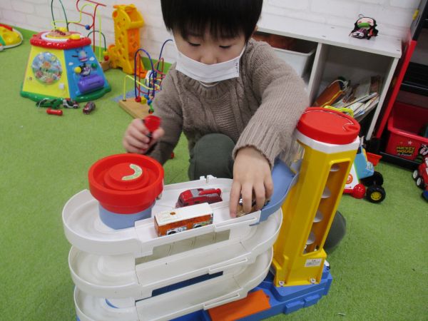 一番乗りの男の子はニコニコでお母さんとバイバイすると大好きな車の玩具に夢中🚗