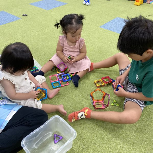 ブロックで「かき氷機作った~🍧」と夏にぴったりな物や動物ランドなどステキな物を楽しそうに作る姿がありました🌟子どもならではの想像力があり、すごいな~と感心させられる事がたくさんあります😆小さいお友だちにはマグネットブロックが人気で、ペタペタくっつけてははずす~を繰り返し楽しんでいました😊遊び方も様々で見ていて楽しいです✨