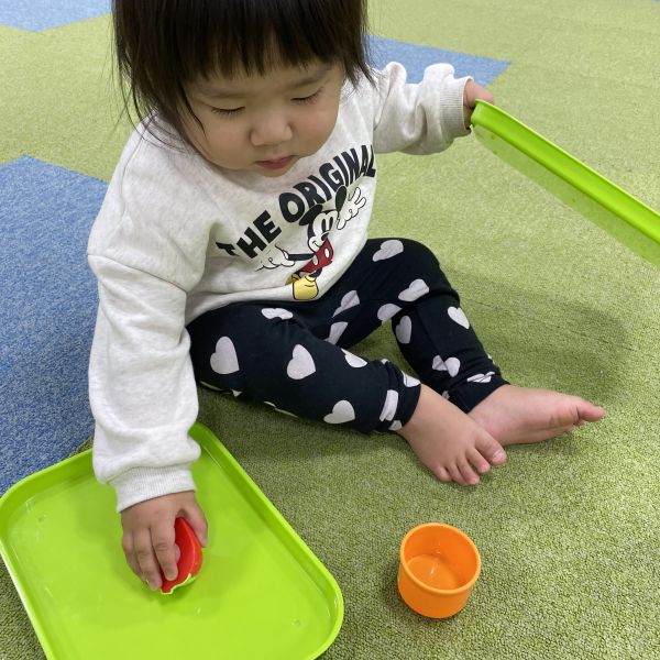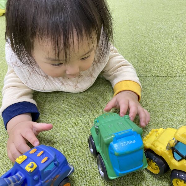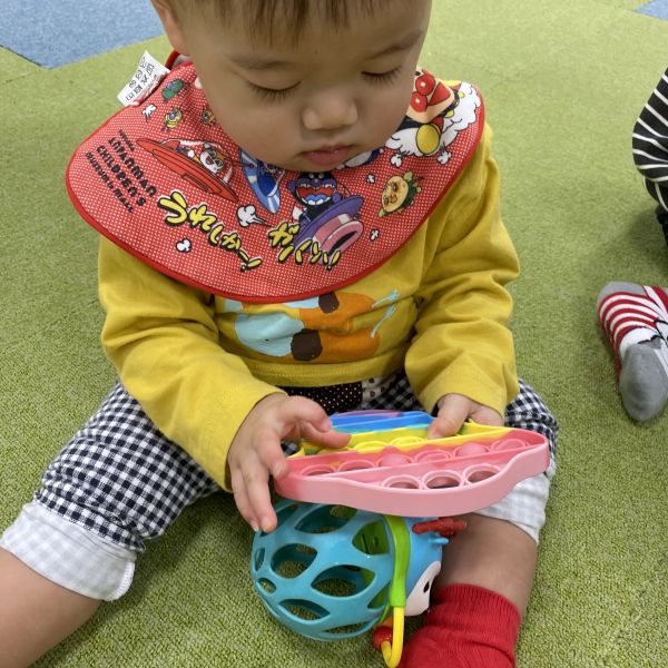 皆で知育トイを使って囲い秘密基地を作ったり、プラレールの線路を繋ぎ合わせ新幹線を選んでどちらが早いか「よーい、どん!!」と勝負をして楽しんでいました🚅小さな男の子たちは、『ブーブー』『がたんごとん』『ぷっぷー』など、たくさん言葉を発して楽しく遊んでいました🚃✨