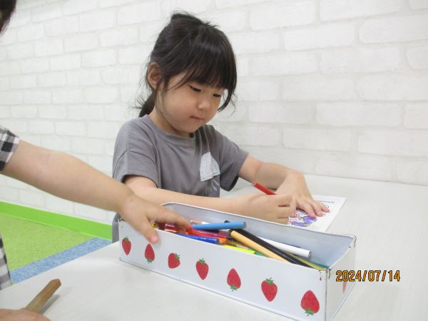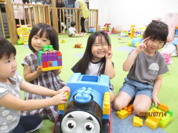 来園したお友だちに「一緒に遊ぼうー」と声を掛けて一緒に遊んでいる姿や塗り絵やブロックで集中して遊んでいる姿がありました🥰
