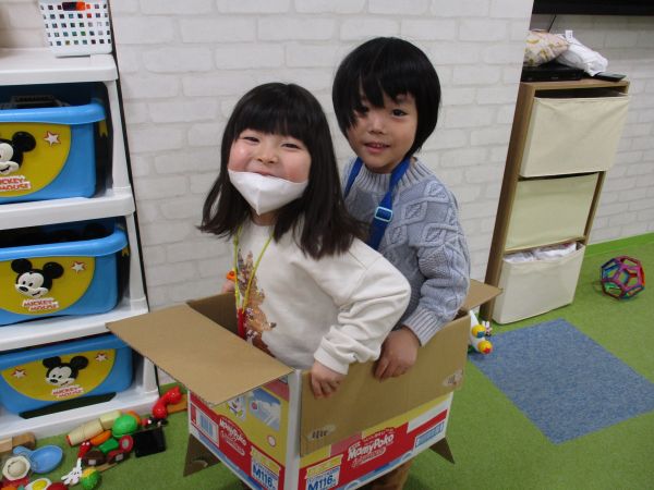 ダンボールで遊びました!!ダンボールの中に入って隠れたり、ひっくり返して机にしたり、底を開けて電車したり、お友だちは大きい子から小さい子までダンボールに夢中でした💗