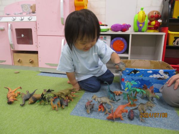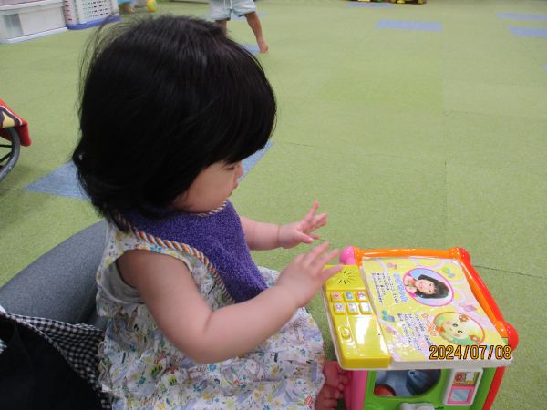 午前中はのんびりモードで、小さな子とせんせいがゆったりと関わり合い、音楽が流れる玩具に興味を示したり、先生のおひざにちょこんと座り、絵本のページをめくって楽しそうに過ごしていました♡