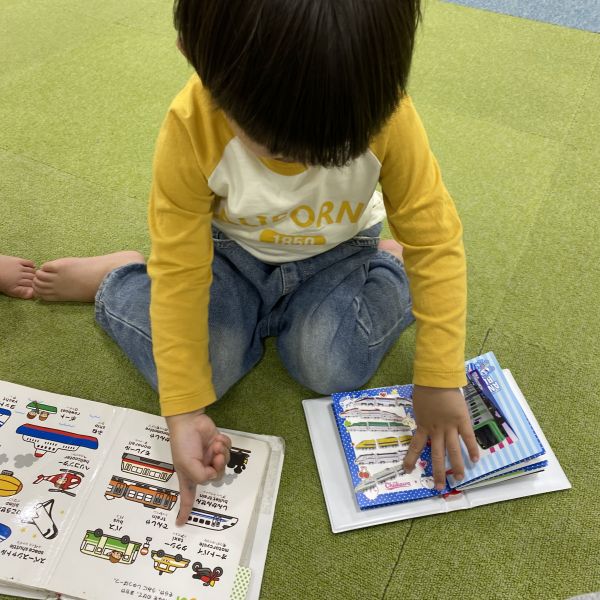 お絵本や図鑑にも興味津々で指さしをしながら「ビービーしゃ🚑」「りんご🍎」知っている単語を言っている姿もありました📖