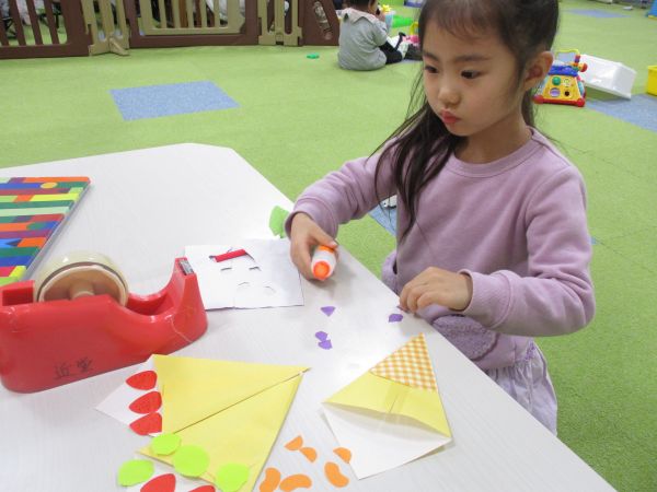 いちご🍓、キウイ🥝、ブルーベリー、キャラメルなど盛りだくさんのクレープを作ってくれました✨お姉ちゃんたちはノリを使ってフルーツを貼りましたが、小さい子はセロハンテープを丸めてフルーツを貼りました🎶ノリもセロハンテープも貼るのは楽しいようでにこにこしながらペタペタしていましたよ😊