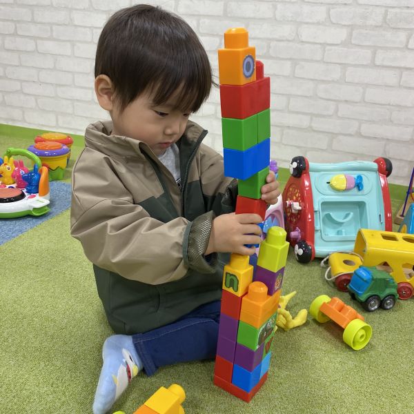 小さなお友だちは、先生の側に座ると落ち着いた様子で、仕掛け玩具を触ったり、カラーブロックを積み上げたり♪楽しくすごしてくれました☺