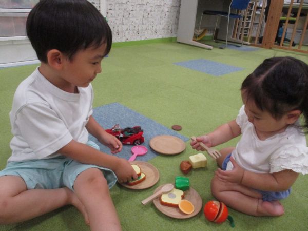 風船遊びや追いかけっこで沢山身体を動かしたり、おままごとではいろんなご飯を作って遊び、最初は涙が出ていた子もニコニコ笑顔💕