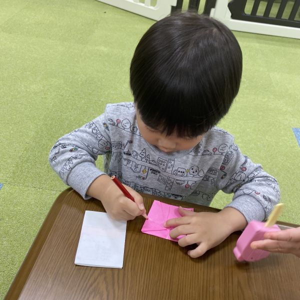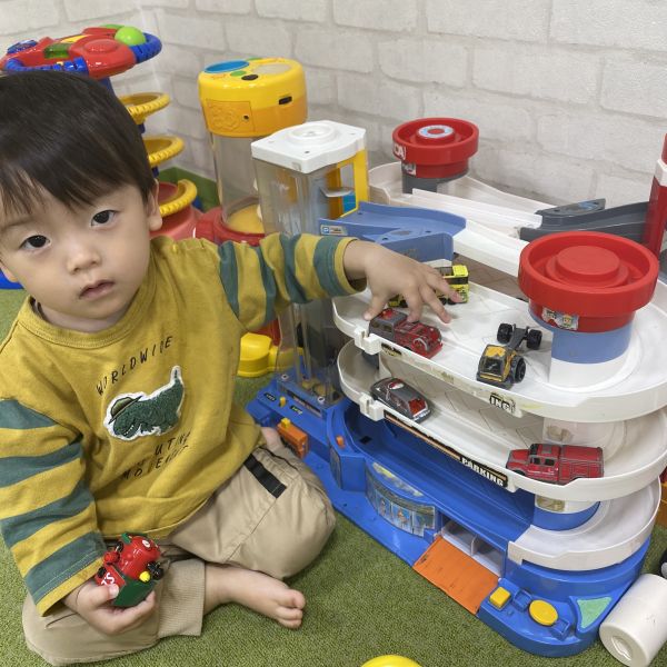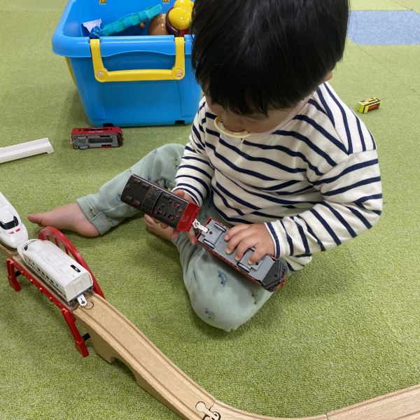 初めましてのお友だちもいましたが、み~んなニコニコ笑顔でお部屋に入室💖小さいお友だちは乗り物が好きなお友だちが多く、プラレールのレールを繋ぎ合わせて新幹線を走らせ保育者に上手でしょ?と言わんばかりに新幹線を持ち上げて可愛くアピールしてくれました🚅他にも自分の周りにミニカーをた~くさん集めてハンドルおもちゃを手に持ち「ブーン」とハンドルを動かし運転をして楽しむ姿がみられましたよ🚗
