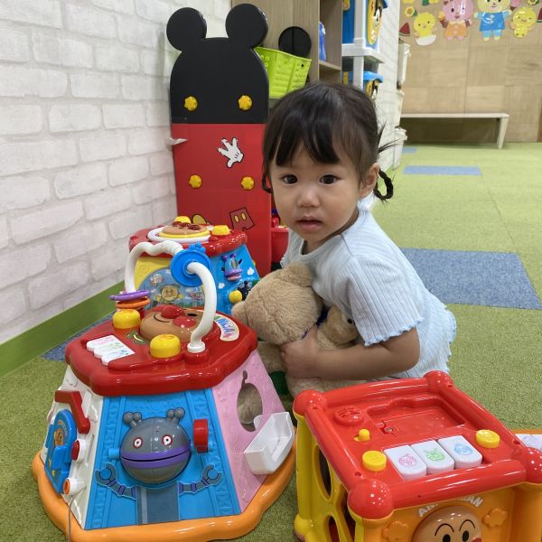 アンパンマンの知育玩具に囲まれてニコニコで遊び、アンパンマンの手遊びを楽しみました(^^♪