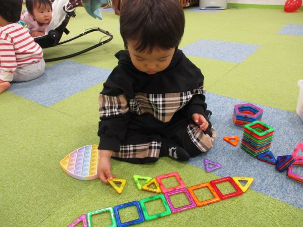 お友だちと遊び「きゃーきゃー」楽しそうに風船遊びをしたり、初めてのお友だちは沢山玩具があるので興味津々で色んな玩具を手に取り遊び楽しんでいました🎶
